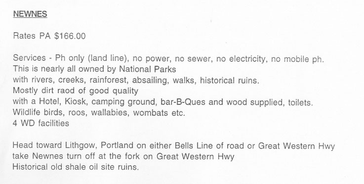 Description: This Block of land is situated in a National Park near Lithgow. Also nearby are Historic ruins. Access to natural spring water. No neighbours, can't be built out. Close by are the National Parks camping grounds. Just over 2 hours to Sydney cbd. Closest town - Lithgow. Can supply photos and other information via email.